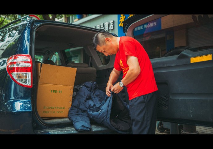 我记得我坐着屠经理的车,让他在后座收拾寄送衣物的时候,我会有些位置和动作上的引导,方便抓拍。涂经理在镜头前,偶尔露出的一丝羞涩,也蛮可爱的。于是,他用手抹抹头上的汗,然后又抓抓后脑勺,一直跟我说:“别拍了别拍了,有什么可拍的嘛,我赶紧把这些东西寄了”,言语间,让这个严肃的经理也会有一些可爱劲儿。